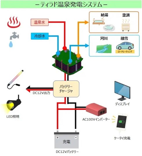 ティラドが開発した熱電発電システムは、熱電モジュールを200枚使用し、夏場の90度の温泉と、25度の冷却水の温度差65度利用し、約100Wの発電が可能だという。実証試験では、この温泉発電器1台を使用し、発電した電力は12Vの蓄電池に充電する。この電力はAC100Vインバーターによりディスプレイなどの電力機器に使用する。