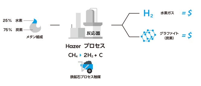 Hazer社が開発を進めるプロセスで、メタンを原料にCO2排出を抑制して、水素と固体の炭素(グラファイト)の2つの価値ある製品を同時に生産する技術です。反応器内で鉄鉱石触媒によりメタンの熱分解反応を促進させて水素と固体の炭素を製造します。