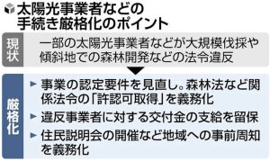ルギー特別措置法に規定された事業の認定要件として、森林法など関係法令に基づく許認可を得ることを義務づける。安全や環境に配慮せず、乱開発する悪質業者を締め出す狙いだ。