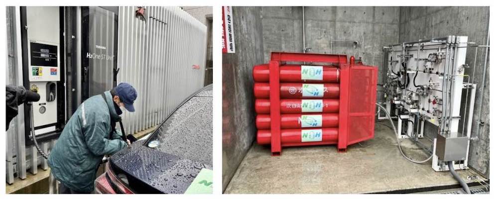 2019年、敦賀市公設市場に設置された「水素ステーション敦賀」は、敷地内の太陽光発電の電力により水素を製造。燃料電池自動車に供給したり、「カードル」と呼ばれる専用の容器に水素を入れて保存し、必要な時に利用したりすることができるようになっています。