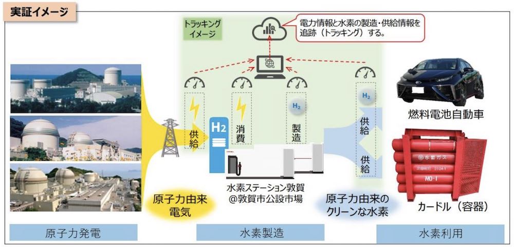 実証では、関西電力の原子力発電所でつくった電気が、送配電網を通じて「水素ステーション敦賀」へと供給され、水素製造に利用されます。原子力発電の電気から水素利用にいたるまでの一連のエネルギーの流れをトラッキングすることにより、その水素が原子力発電の電気によって製造されたことが特定可能となります。