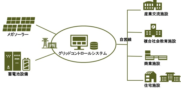 大熊町のスマコミ事業は効果的に地産地消を実現する為、メガソーラー・蓄電池・需要家を自営線でグリッド化する。イメージ図の左下の4メガワットの大型蓄電施設(イメージ図の施設の3日分を蓄積できる)を組み込みことにより天候に左右されず、夜間にも稼働が可能になるとのこと。