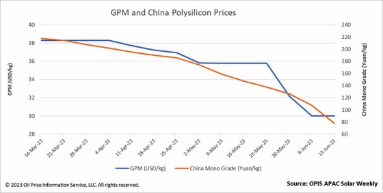 OPISによると、中国国内のポリシリコンや太陽電池モジュールは供給過剰の状態にあるとのこと。また、中国製太陽電池モジュールの出荷先であるヨーロッパでも在庫過剰な状態が続いていることから、ポリシリコンや太陽電池モジュールの価格は今後も下落し続けると予想されているとのこと。