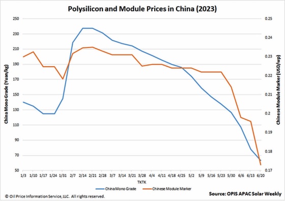 ダウ・ジョーンズ傘下のエネルギー関連調査会社「OPIS」が、中国での太陽電池モジュール価格暴落を報告しています。価格の下落には太陽電池モジュールの供給過剰が影響していると指摘されており、下落傾向が今後も続く可能性が示唆されています。