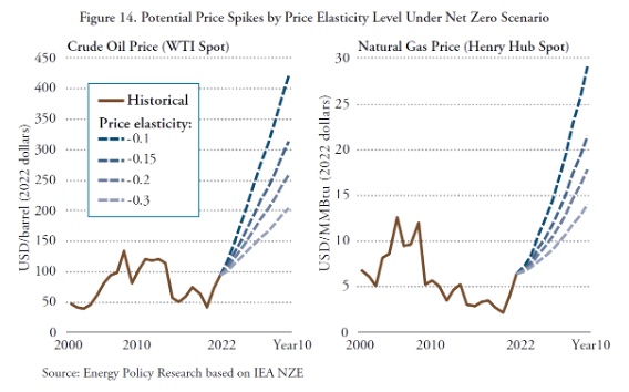 この莫大な需要減少を引き起こす価格水準は、経験的な価格弾性値によって計算できる。すると石油価格水準(WTIスポット価格)はバレルあたり200ドルから400ドル、天然ガス価格(ヘンリーハブスポット価格)はMMBtuあたり15ドルから30ドルと暴騰することになる(下図、左が石油価格、右が天然ガス価格)。
