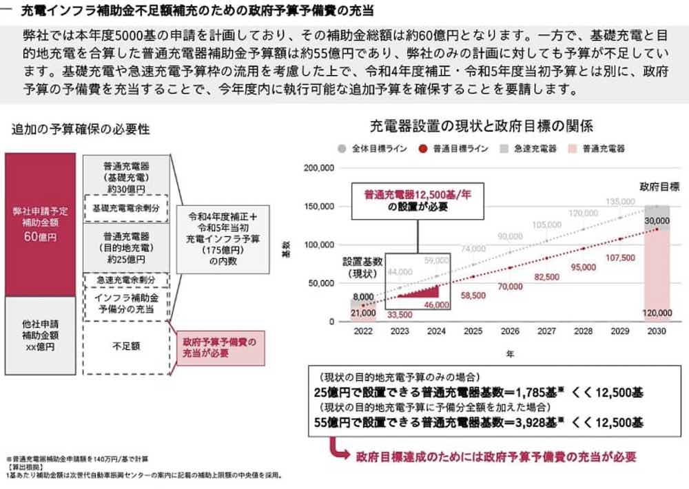 政府はGX(Green Transformation)を掲げるなか、EVの推進を促しているが、EV充電器設置を目的とした補助金は、その設置箇所を増やし、EVの利便性を高めることを目的としている。たとえば、政府は、2030年までに国内に120,000台の普通充電器(目的地充電)の普及を目指しているが、これを実現するには、年間12,500台の充電器を設置する必要がある。しかし、現状、目的地充電向けの補助金は25億円しかなく、年間約2,000台分の予算しかない。これでは目標を達成するのは到底困難な状況だ。城口氏によれば、本来なら予算規模は毎年500~700億円が必要という。