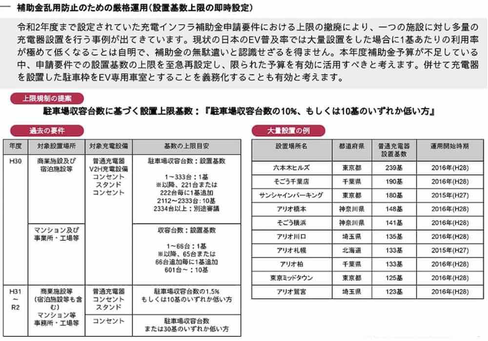 現状のEVの普及率では「100台中10台分あれば十分」であり、従来の制限が厳しすぎたのは確かだが、上限を撤廃したのはやりすぎだと指摘されている。