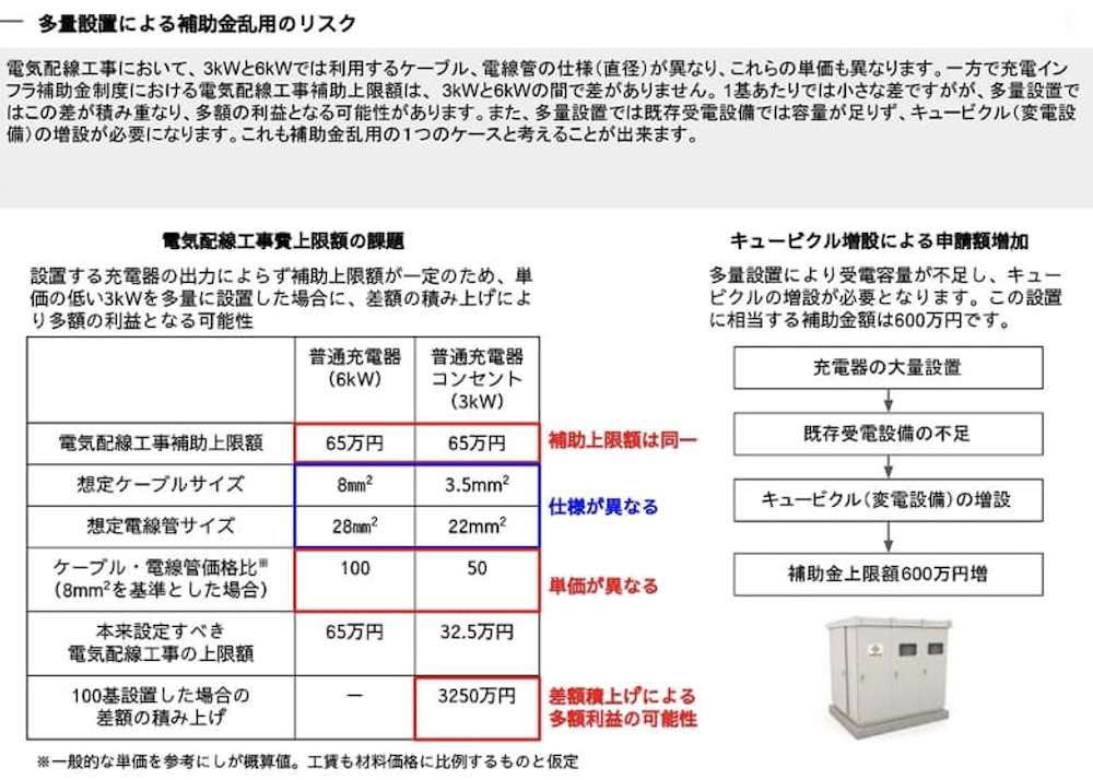 また、日本で現在主力の充電器の出力は6kWと3kWがあるが、どちらも1台あたりの補助金の最大額は同じで「65万円」。設置コストは勿論3kWのほうが安価で6kWの半額程度で設置可能だが、実際にはさまざまな「テクニック」を駆使して3kW充電器を設置しながら「満額の補助金」が申請されるケースが多いという。