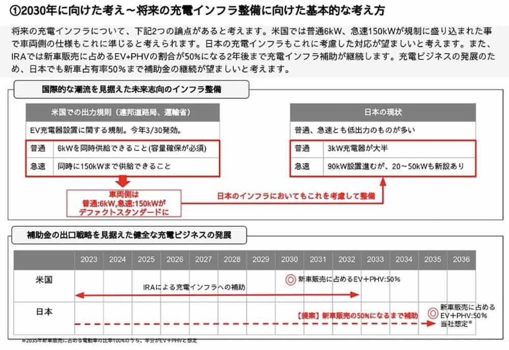 充電の高速化についても、日本は不利な状況にある。米国では普通充電は6kWが、急速充電は150kWが「最低ライン」というガイドラインが定められ、これを元に補助金が分配されるようになる。これらはあくまで最低ラインであり、普通充電は10kWでもそれ以上でもかまわない。実際に10kW以上で充電できるEV車両は多数あり、6kWという出力は取り立てて高出力というわけではない。
