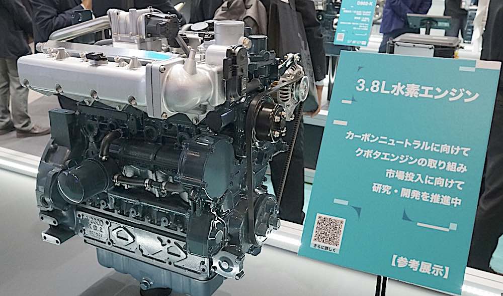 クボタは開発中の産業用水素エンジンを公開した。デンヨーが開発を進める「水素専焼発電機」への搭載を想定する。