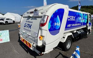 展示されていたのは福岡市と一緒に検証を行なっているFCごみ収集車だったが、これは福岡市のごみ収集時刻が夜でもあり、とくに静かなごみ収集車が求められているため。電動で走り、電動でごみ収集部を駆動するFCごみ収集車であれば、静かな住宅地においても使い勝手が大変よく。グローバルに引き合いが多いとのこと。