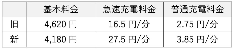 月額料金が4,620円から4,180円に若干値下がりする一方、充電時間に応じて支払う都度利用料金が大幅にアップ。急速充電では1分あたり16.5円から27.5円。67%の値上がりです。普通充電も1分あたり2.75円から3.85円と40%上昇します。30分急速充電した場合の料金は、これまでの495円が825円になりますから、今回の値上げ幅がかなり大きいことがわかります。