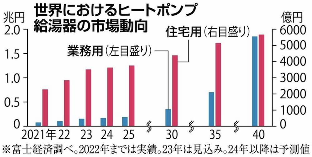 海外では、ロシアのウクライナ侵略に伴い、露産天然ガス依存からの脱却を目指す欧州や、脱炭素化に向けた政策面の後押しがある中国を中心に需要が高まっている。民間調査会社の富士経済は、2022年に1053億円だった業務用ヒートポンプ給湯器の世界市場は、40年に約17・6倍の1兆8513億円に拡大すると予測している。住宅向けヒートポンプ式給湯器の世界市場も40年には22年の約2倍の市場規模に拡大すると見込む。