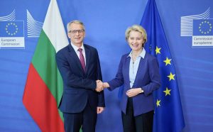 ブルガリアのニコライ・デンコフ首相(左側)と握手するウルズラ・フォン・デア・ライエン欧州委員会委員長