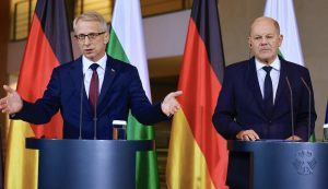 ドイツ・ベルリンの首相官邸で共同記者会見に臨むドイツのオラフ・ショルツ首相(右)と訪問中のブルガリアのニコライ・デンコフ首相(左)