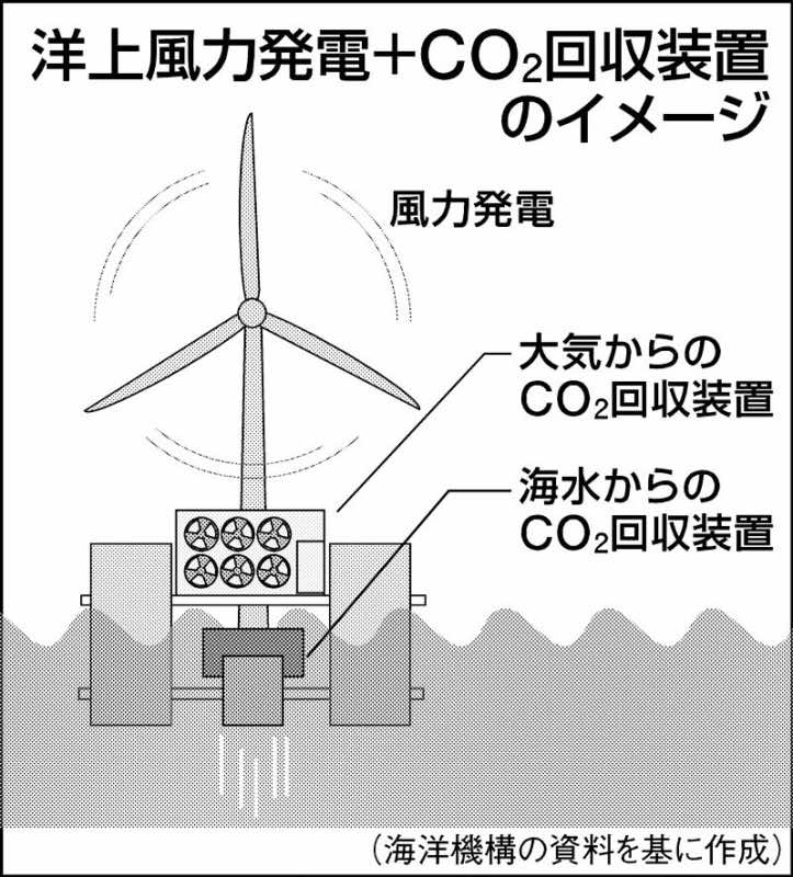 海洋研究開発機構の吉田弘グループリーダーは清水建設やケミックス(相模原市南区)と共同で、海水から二酸化炭素(CO2)を回収するシステムを開発した。電気透析で海水を酸性化し、CO2を放出させる。大気の20倍の濃度のCO2を得られた。海水に含まれる炭素量は大気の120倍。洋上風力発電と組み合わせ、余剰電力でCO2を回収するシステムとして提案していく。