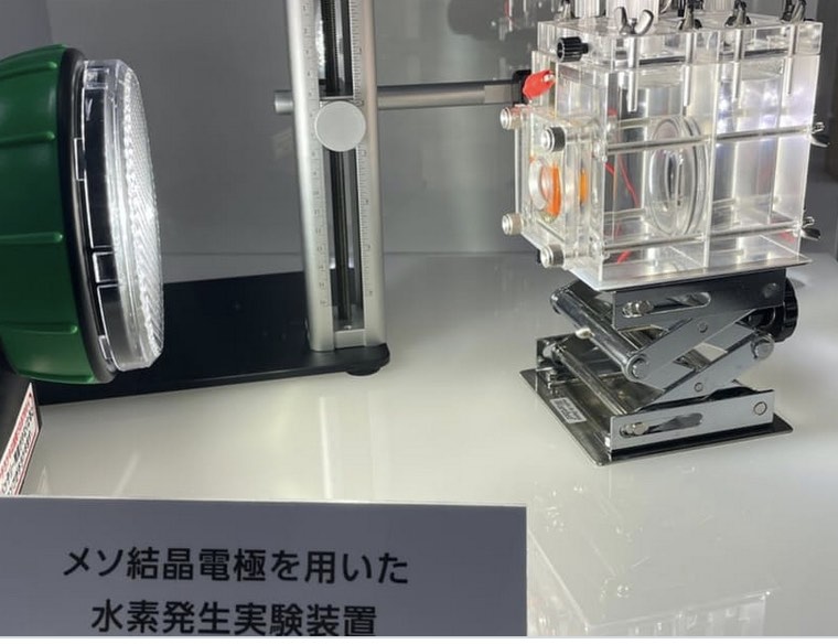 グリーン水素は太陽電池からの電気分解で水素を発生させるのではなく、写真の装置で電気を使わずに直接太陽光から水素を発生させるメゾ結晶電極を用いた水素発生装置を使うとのこと。