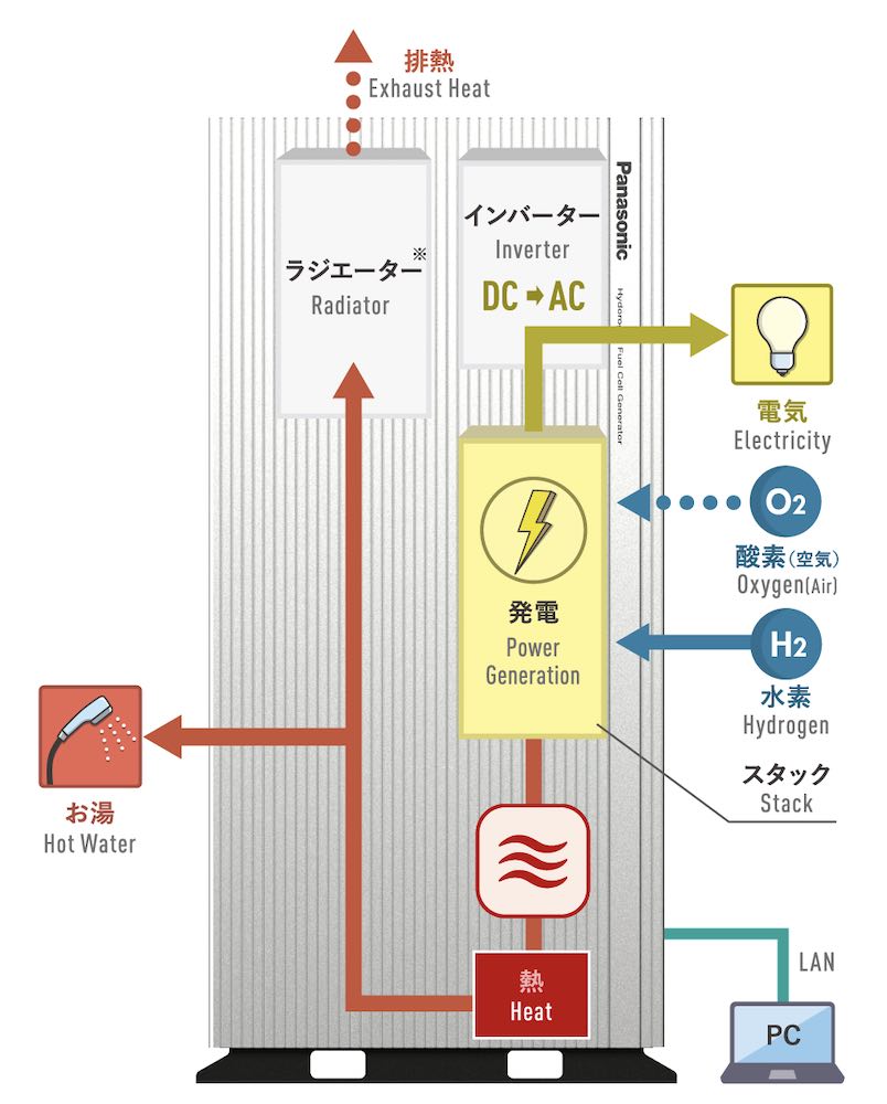 生成したグリーン水素をタンクに溜め、下図パナソニック製の家庭用純水素燃料電池(水素対応エネファーム)を使って電気と温水を一般家庭で活用することを目指しているとのこと。