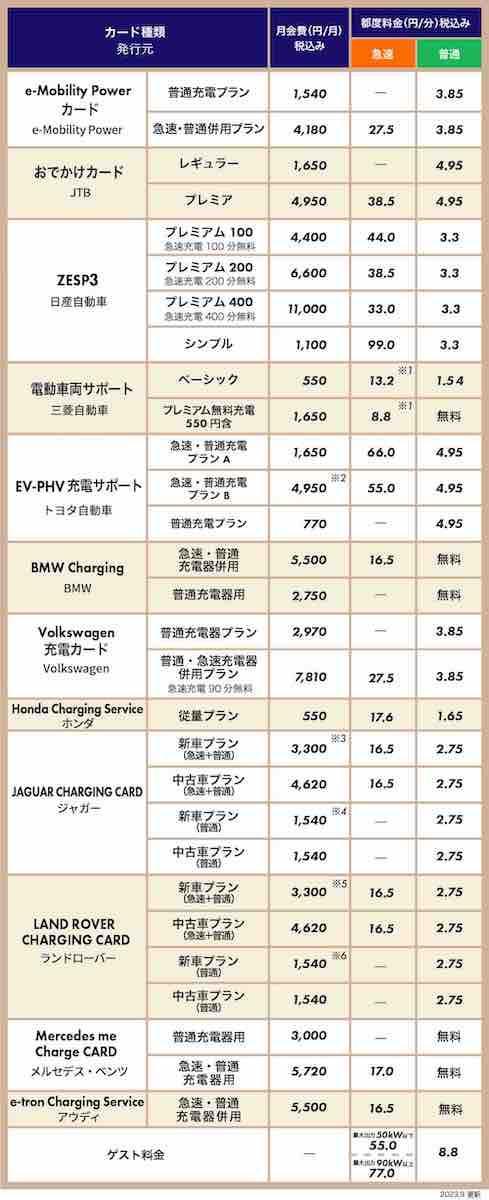 上記のEVの計算は、自宅のみで充電した場合の比較です。EVはガソリンスタンドのように外出時は急速充電器を使うことになりますが、下記図のように料金は各社まちまちで、月額基本料もかかります。(また本年各社とも大幅に利用料の値上げがありました)。使い方によってはガソリン車より費用がかかることがあります。(急速充電を使うには、平均で月額基本料4,180円で充電時は分16.5円かかります)