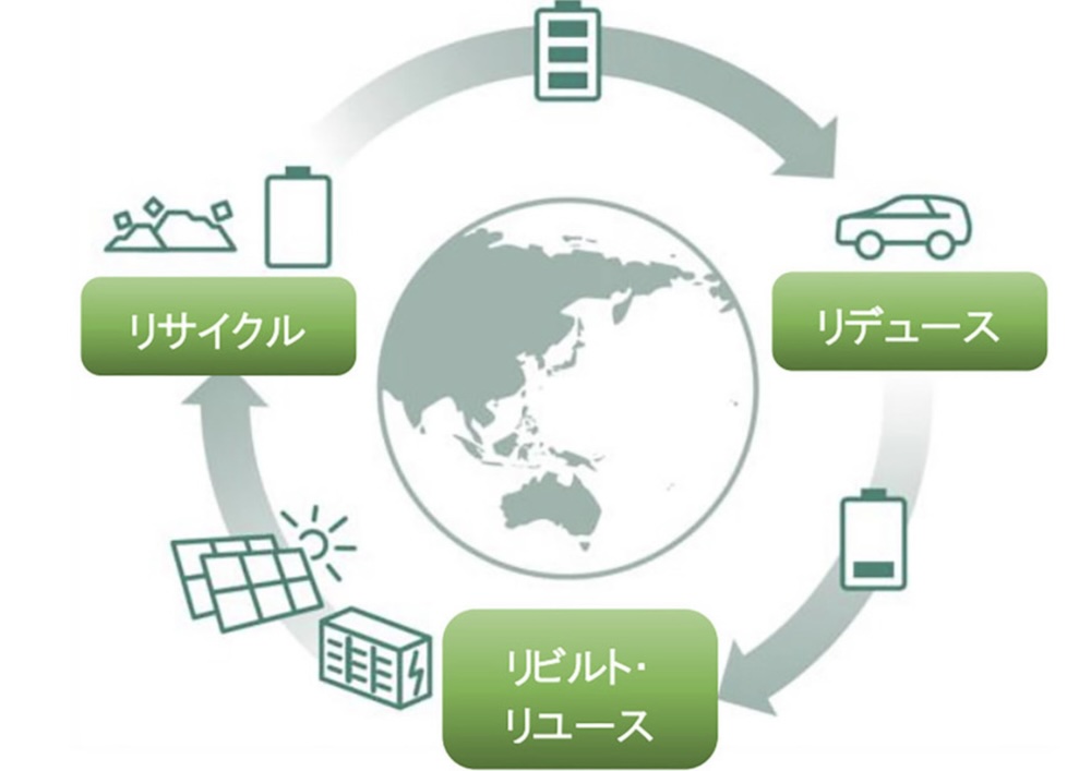 なかでも電動車専用バッテリーについては、省資源でできる電池の開発や長寿命電池を開発し、長期間安心してクルマに乗ってもらえることを目指している。その後、リビルト・リユースとして、最後にCO2排出量の少ない方法でリサイクルを行うといった「電池3R(①Reduce ②Rebuilt・Reuse ③Recycle)」の考えのもと、限りある資源を大切に使う取り組みに着手している。