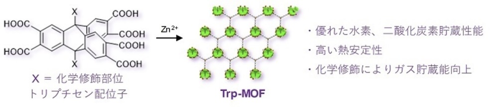 研究グループは「大量に二酸化炭素や水素を貯蔵できる有機金属構造体の合成を達成した。ガス吸着にはガスの種類に応じた適切な細孔が必要であり、剛直なトリプチセン分子(プロペラ型分子)を活用することでさまざまなサイズの細孔を形成できるようになった。今後は、金属種の変更などを行い、より高いガス貯蔵能を目指していく」としている。