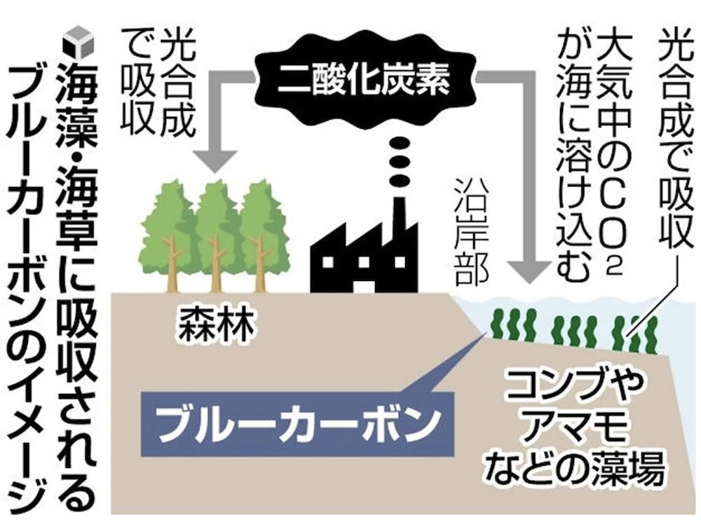 国内で21年度に植物が吸収したCO2量4760万トンのほとんどは、森林が吸収源。森林は今後、老化で吸収量が減退する見通しで、吸収量全体に占めるブルーカーボンの割合は30年に1割に達するとの試算もある。同省は「海に囲まれた地形をいかし、藻場の造成などブルーカーボンを活用した脱炭素化に努めたい」としている。