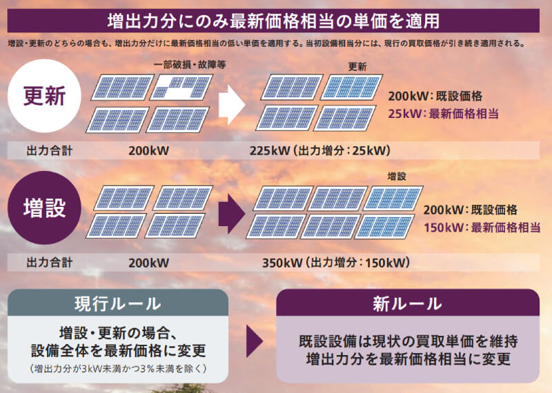 経済産業省・資源エネルギー庁は、既存の太陽光発電設備の増設・更新を促すため、2024年度からルールを見直す。増設・更新した場合には、増出力分にのみ最新価格相当の単価を適用する。パネル増設と併せて古い設備をリパワリングし、長期にわたって安定的な運用を目指す。