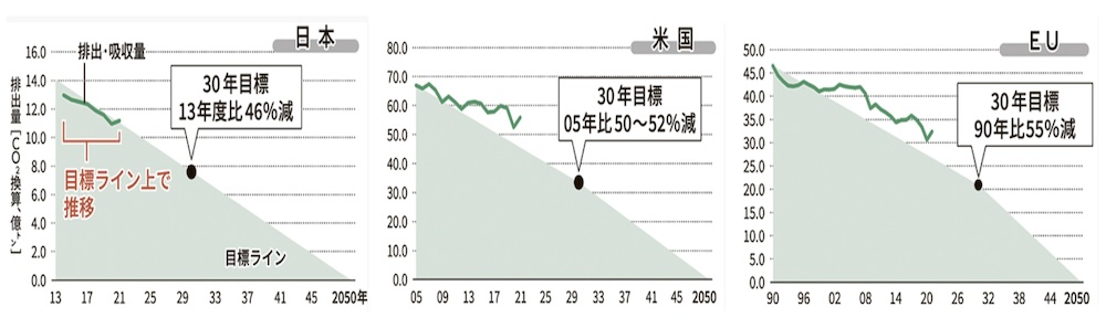 温室ガス排出量削減/進捗に先進国で差、日本は目標ライン内を維持 投稿者: scn-pc 投稿日: 2024年1月20日 【SCN投稿記事のスタンス】←タッチしてご確認ください。 日本・米国・EUの排出量削減の進捗比較 ※環境省資料より 欧米の先進国の温室効果ガス(GHG)排出量が、削減の目標ラインを大きく超過している。先進各国は2050年に排出を実質ゼロにする野心的な目標を掲げたが、21年時点で米国は10億トン、欧州連合(EU)は5億トン以上乖離(かいり)。日本は着実に排出を減らし、目標ライン上に乗る「オントラック」の国の一つ。伊藤信太郎環境相は「日本は196カ国の中でまれに見るオントラックな削減をしている」と訴える。 電気新聞記事から抜粋 続きを読む 前の記事 デンソー新型「V2H充放電器」受注開始。63%小型軽量化次の記事 福岡県、地球温暖化をワカメが救う。「海の砂漠化」を防ぐ
