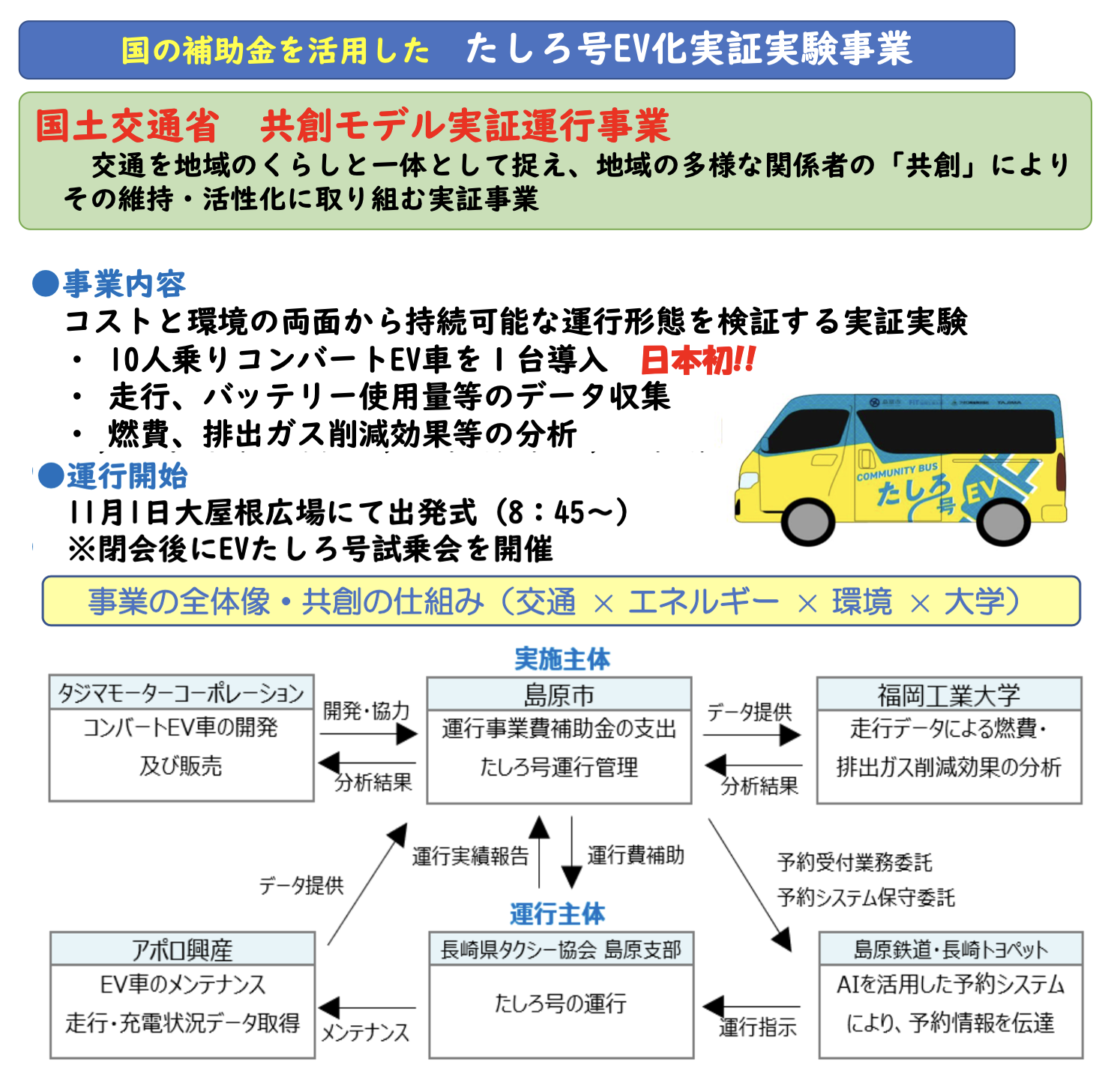 島原市コミュニティバス「EVたしろ号」の出発式が行われ、参加しましたので報告いたします。