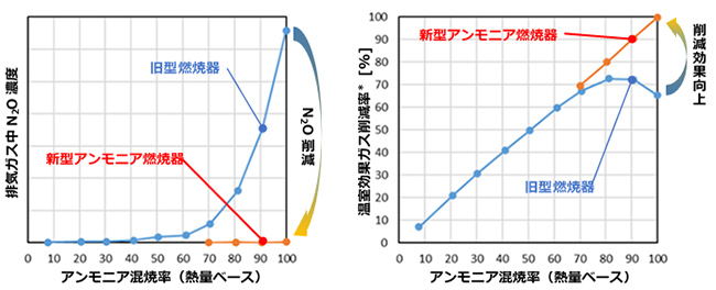 一方で,液体アンモニアは,天然ガスやアンモニアガスよりも燃焼性が低く燃えにくいため,アンモニア混焼率を高めた際,安定的なアンモニア燃焼と排気ガス中の温室効果ガスの排出抑制が課題となります。これまでは70%を超える高いアンモニア混焼率での運転時に,温室効果ガスの一種であり,CO2の約300倍の温室効果を持つ亜酸化窒素(N2O)が発生し,CO2排出量を削減できても温室効果ガス削減にはつながらないことが課題となっていました。
