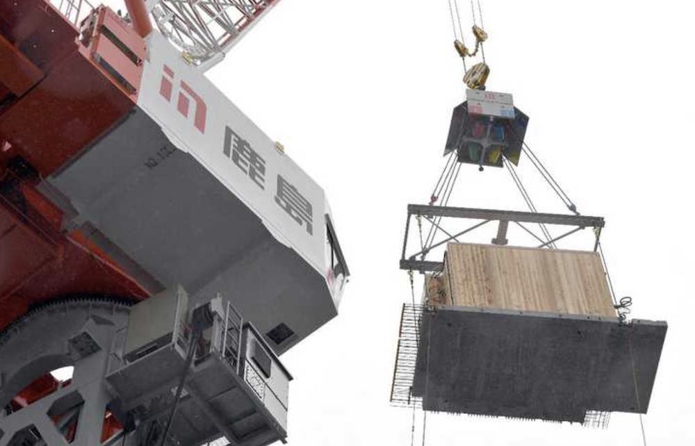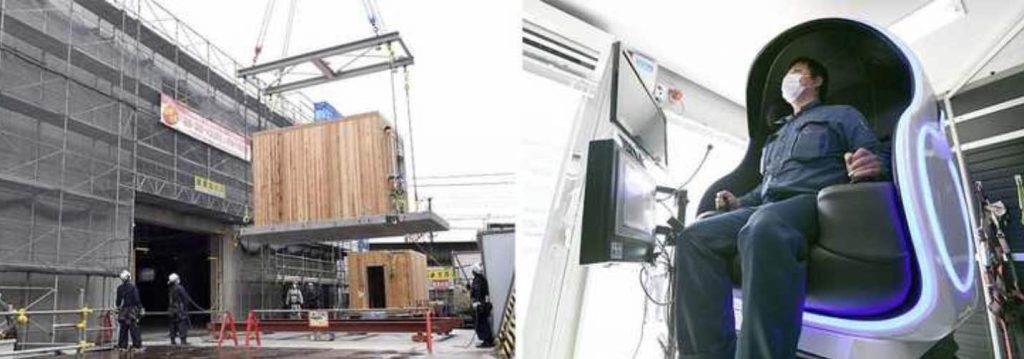 コンクリートの床板に建つ、木材の壁と天井が清々(すがすが)しい印象の1ルーム。シャワーや洗面台、ベッドも据え付けた空間を収めた“箱”が、「玉掛けよし!」の掛け声を合図に地上から浮上し始める。頭上のタワークレーンが稼働音を響かせながらゆっくりと床板に付けた吊(つ)り具を引き上げ、建設中の施設5階にブロックのように取り付けると「宿泊室」がほぼ完成した。