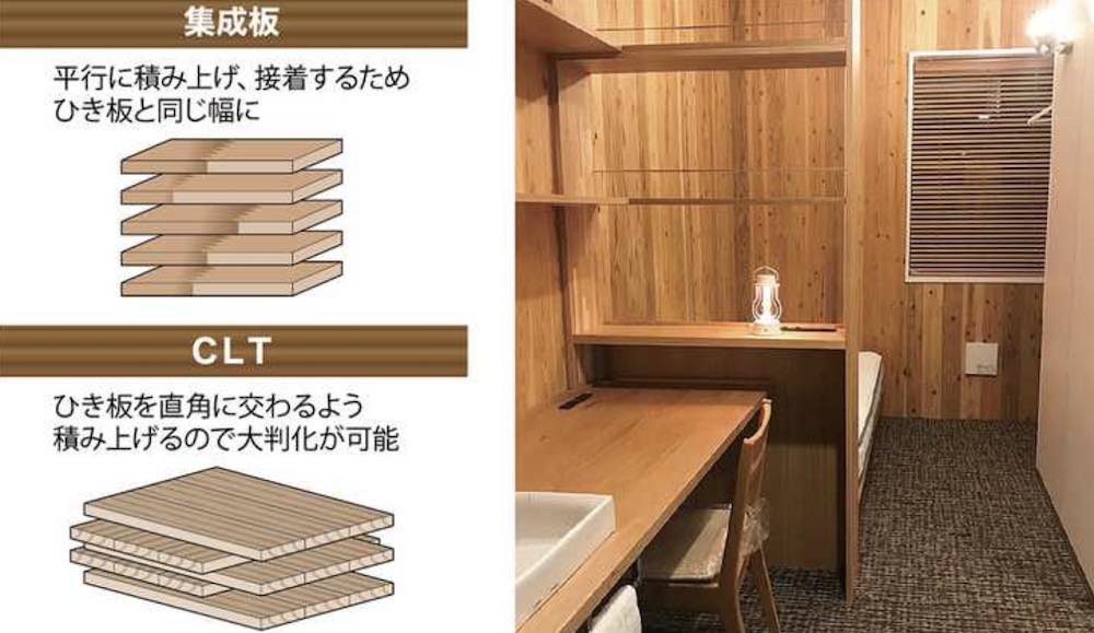 この工法では「CLT(直交集成板)」と呼ばれる木材パネルを宿泊室の壁と天井に採用している。厚さ30ミリのひき板を3層に重ねて接着したスギ材を使ったパネルは、各層が縦横に交わる構造。平行に積層する「集成板」は用途が柱や梁(はり)に限られるが、CLTは大判化が可能で壁や天井にも利用が広がる。分割して運搬でき道路事情に合わせられるため、「国内の施工条件に適合したユニット化工法を実現できた」(建築技術部)。