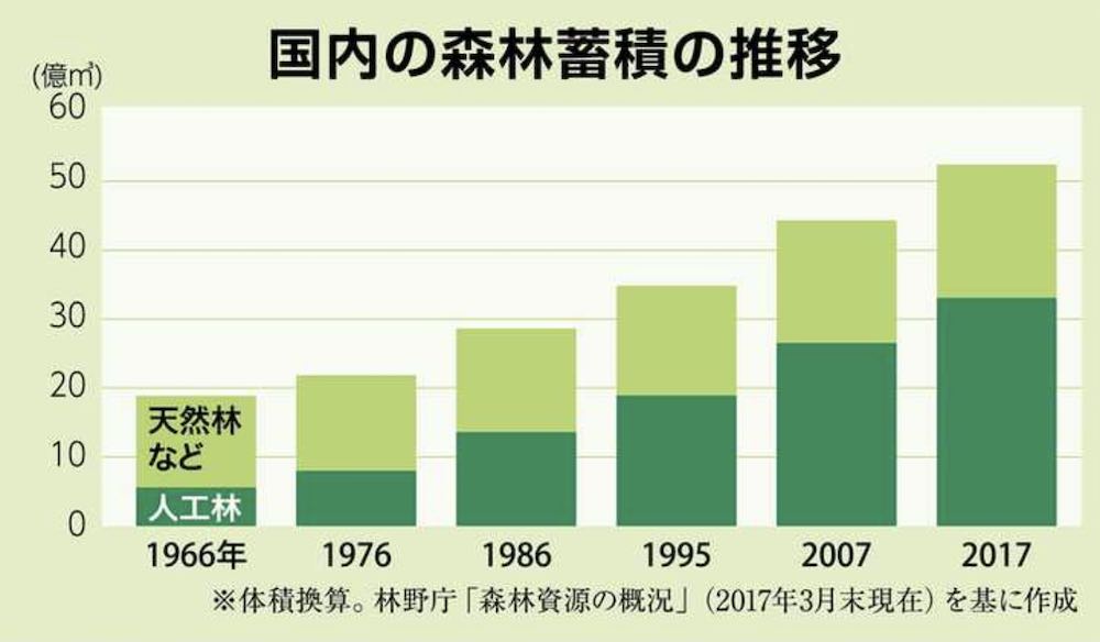 高度成長期に植林が進んだ国内の人工林は増加を続け、樹木の蓄積量は体積換算で30億立方メートルを超えている。うち利用の「適齢期」とされる樹齢50年超が半分以上(※2)を占め、伐採・植え替えは待ったなし。間伐材などは放置するとやがて腐朽し、CO2を大気中に放出するため、脱炭素に向け利用促進が求められている。