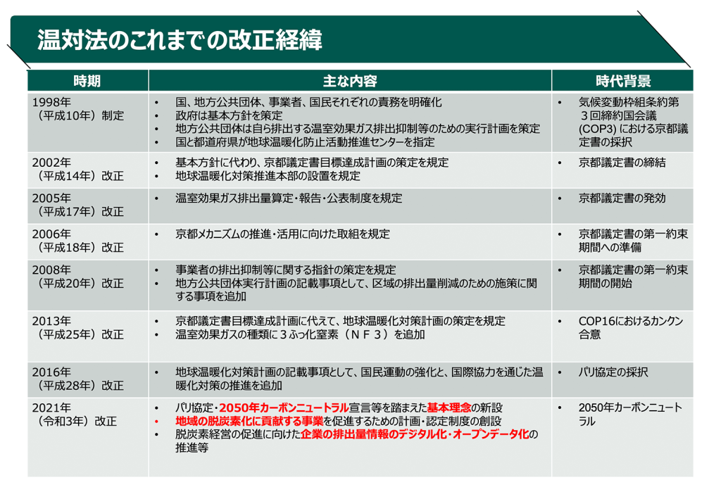 制定された当初は、政府における基本方針の策定、地方自治体における実行計画の策定などが主な制度の内容でしたが、京都議定書の締結やCOP16におけるカンクン合意などを背景に、地球温暖化対策本部の設置、温室効果ガス排出量算定・報告・公表制度の制定など
